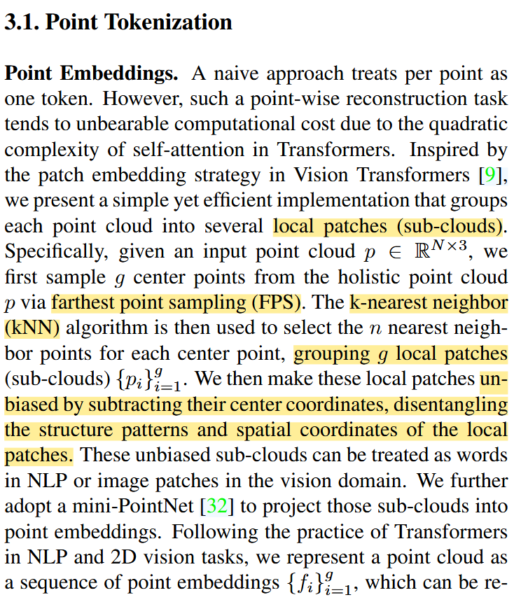 3.1 Point Tokenization a. Point Embeddings Vision Transformer에서 사용하는 patch 임베딩 전략을 참고하여, 포인트 클라우드를 여러 개의 local patch로 나눈다고 한다. 구체적으로는 1. FPS을 통해 중심점을 고르게 샘플링 2. 중심점 기준으로 KNN을 사용하여 k개의 포인트들로 그룹 구성 3. 구성된 포인트 그룹을 patch라고 부르며, 하나의 입력 토큰으로 활용 이후에 각 patch는 중심 좌표를 빼주는 방식으로 정규화하는데 이는 위치 정보와 구조 정보를 분리하여, 위치에 관계없는 구조 패턴만을 학습하기 위해서 라고 한다. ex) 바닥에 있는 사과, 테이블 위의 사과는 위치는 다르지만 구조적으로는 같으므로, 구조 패턴만 학습하게 되는 것 끝으로 정규화된 patch는 mini-PointNet을 통해 임베딩되고, 이후 Transformer에 입력되기 전에 다시 각 patch의 중심 좌표를 기반으로 positional encoding을 더해 마무리한다고 한다. |