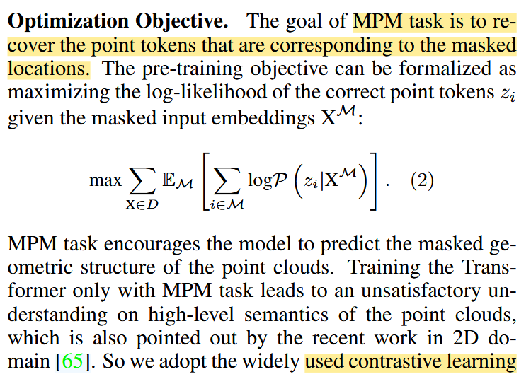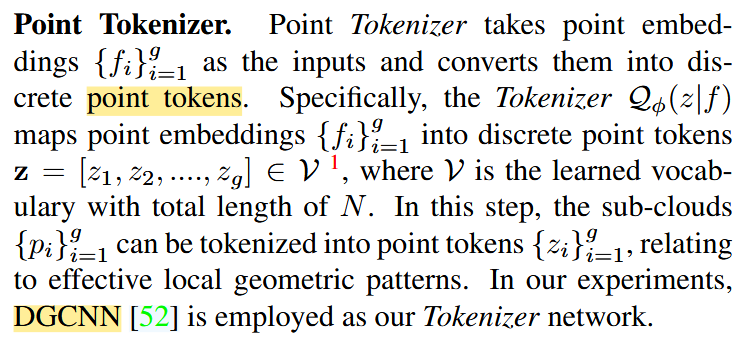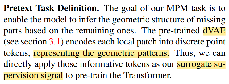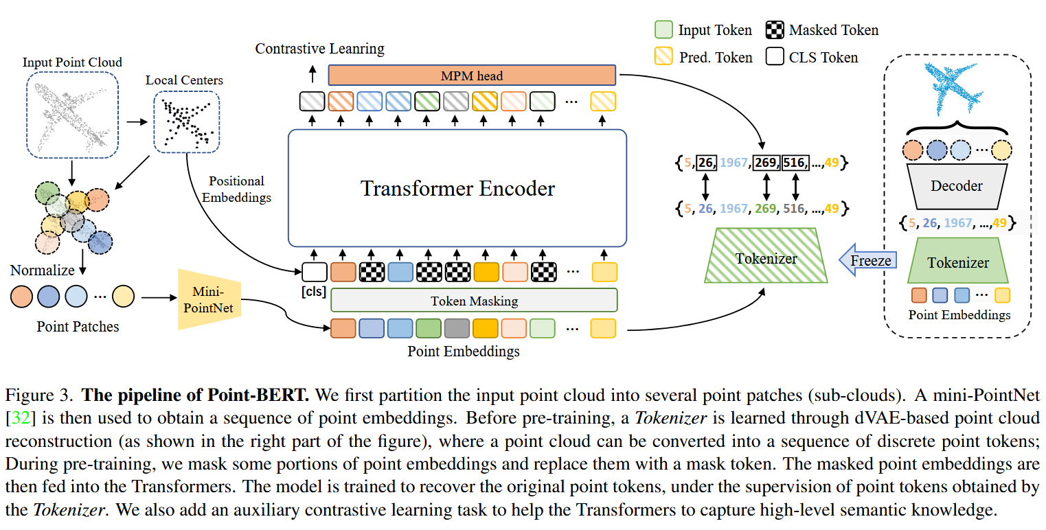 즉, 포인트 클라우드에도 언어의 단어처럼 사용할 수 있는 "기하학적 의미 토큰"을 정의하고, 이를 통해 마스킹 복원 방식의 학습이 가능하도록 만든 것이다.