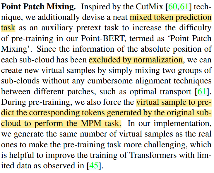 c. Point Patch Mixing 서로 다른 두 개의 patch를 섞어서 새로운 데이터를 만드는 보조 pretext task 영역인데, 더 어려운 문제를 풀도록 유도해서 학습 효과를 높이기 위한 목적이라고한다. 요약하면 가짜 샘플을 만들고 그것도 맞히게 만들어 사전학습 난이도를 높이는 기법 |