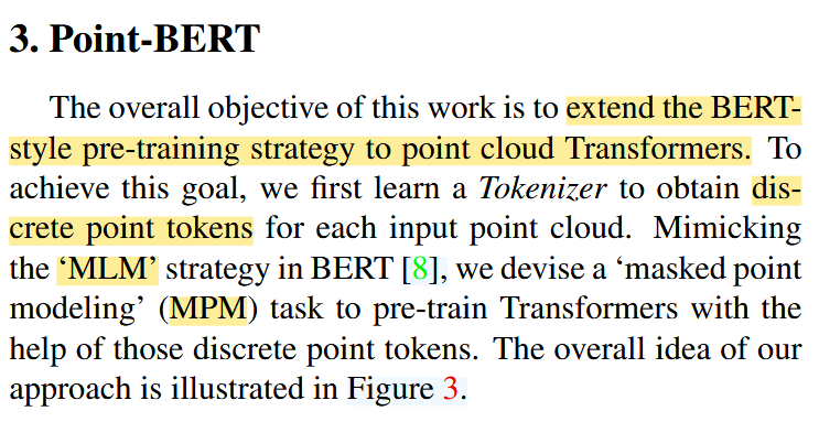 Point-BERT는 LLM의 BERT 구조에서 아이디어를 얻어, 이를 3D 포인트 클라우드에 적용한 사전학습 방법이다.
