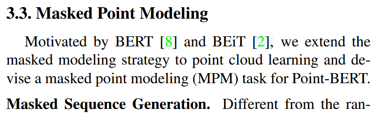 1. Point-BERT BERT 스타일의 사전학습 전략을 포인트 클라우드 Transformer에 확장하는 것이 목표 그러기 위해서 이산적인 포인트 토큰을 생성할 수 있는 Tokenizer 학습하고, BERT의 MLM 방식을 모방해서 dis-crete 포인트 토큰을 기반으로 마스킹된 포인트를 복원하는 MPM을 설계해 Transformer를 사전학습한다. |