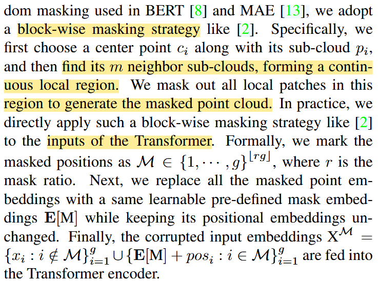 3.2 Transformer Backbone 포인트 클라우드 입력이 어떻게 transformer 입력으로 들어가는지 입력 구조를 설명한다. a. local patch 나누기 - 전체 포인트를 g 그룹으로 나눔 = patch b. mini-pointnet - 포인트 임베딩 - 각 patch를 mini-pointnet에 넣어서 패치가 어떤 구조인지 요약해주는 feature vector(fi)를 추출함. c. positional embedding - 위치 임베딩 - 각 patch의 중심 좌표를 mlp에 넣어서 위치 정보에 대한 feature를 추출. d. embedding 결합 - transformer에 들어가는 입력은 최종적으로 포인트 임베딩 + 위치 임베딩 - 최종 입력 벡터 xi 생성 e. class token 추가 - transformer 일반적인 방법으로 입력 앞에 class token E[s]를 추가. - 이 토큰은 "전체 구조를 요약할 특성"을 담기 위한 공간이라고 보면 될듯 f. transformer에 입력 |
